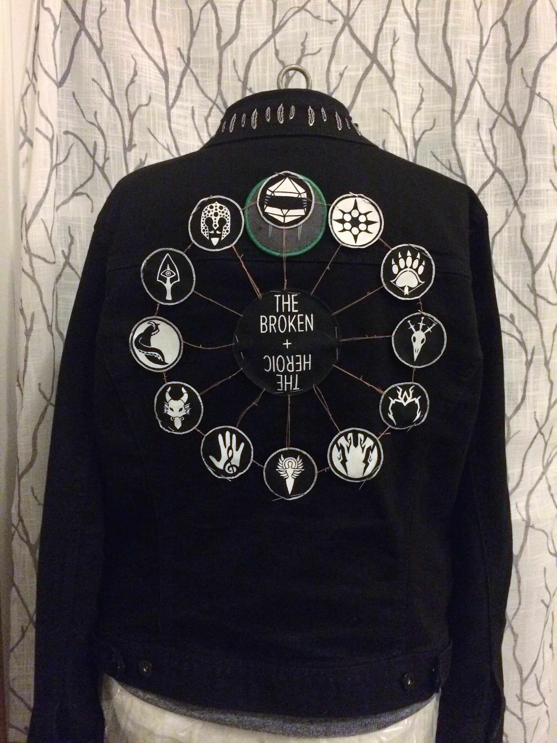 I didn’t know what to do with myself after disability cost me my job. The Critter community had surrounded me with art and artists, so that seemed as good a pastime as any. I started a punk jacket with the official Critical Role patches. I added on pins to specifically for friends and family to keep them close. A few pins were made by friends. Cloth armor enchanted with their love. I found these amazing gem stones like dragon scales, and added them to the pockets to mark the ancient dragons they’d slain. With a charm at the point for the gods that helped them. I added silver feathers to the collar like the Deathwalker’s Ward armor. I used charms to sew a Whitestone crest. It was incredibly over the top. Everything was sewn on individually by hand.